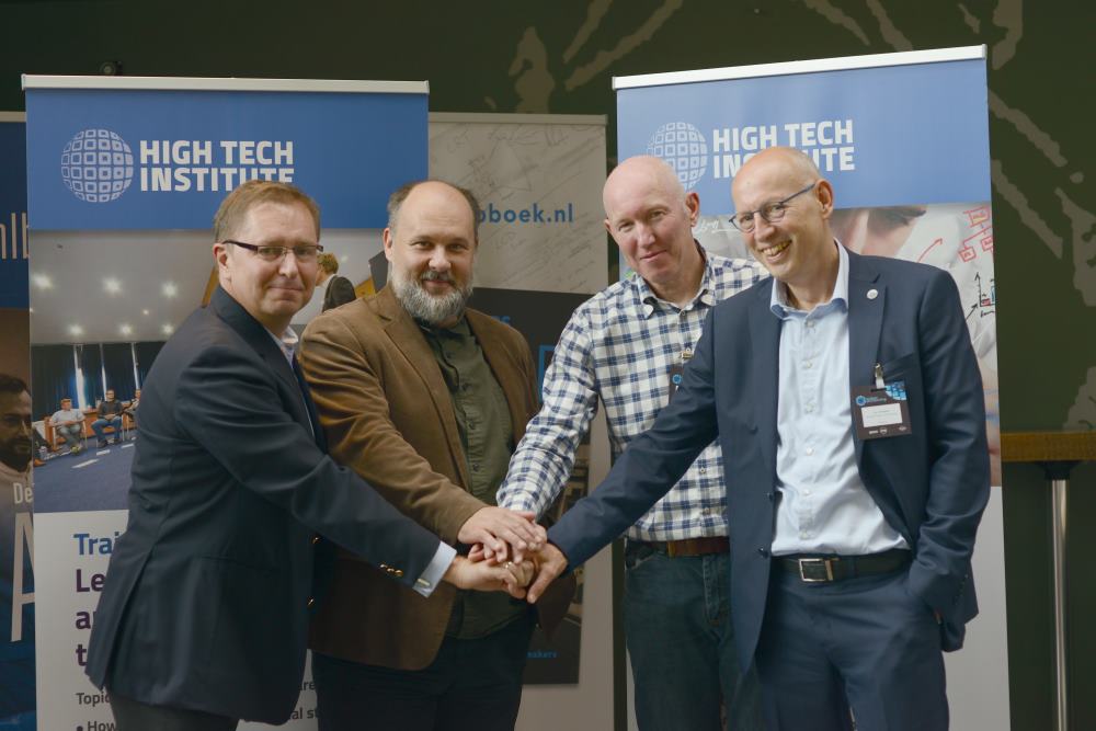‘In our training course you don’t learn how to hack, but you do learn how to sideline hackers,’ say Ernõ Jeges (2nd from left) and László Drajkó (left) from Cydrill. They recently entered into a joint collaboration with René Raaijmakers (2nd from the right) and Ger Schoeber (right) from High Tech Institute.
